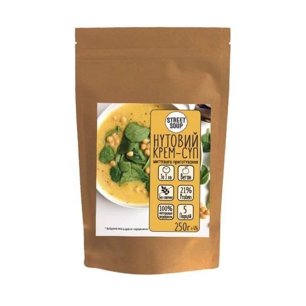 Нутовий крем-суп Street Soup 250 г — це натуральний крем-суп миттєвого приготування в упаковці з zip-замком для зручного зберігання! Це Ваш швидкий, корисний, повноцінний обід для всієї родини або великої компанії! Зручно, коли відключають електроенергію — просто додайте гарячу воду з термосу і ваш суп готовий! 1 упаковка = 5 порцій крем-супу.